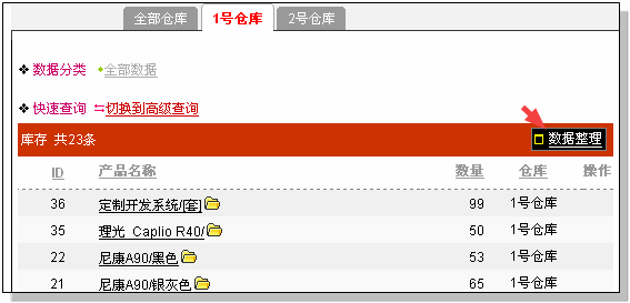 进入库存列表,点击本仓库标签,在列表上有一个“数据整理”按钮,点击它即可把库存